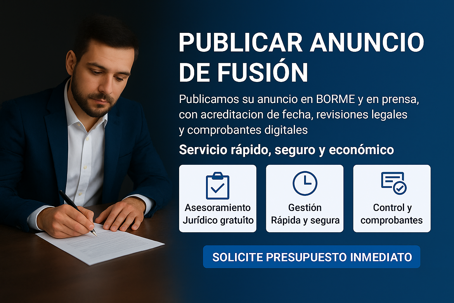 Presupuesto inmediato: Complete nuestro formulario adjuntando el texto de su anuncio de fusión societaria y reciba en menos de 1 hora una valoración sin compromiso. Además, le entregamos para su validación el borrador listo para su publicación en BORME y prensa oficial, junto con instrucciones claras para ordenar la publicación y cumplir con su difusión legal.